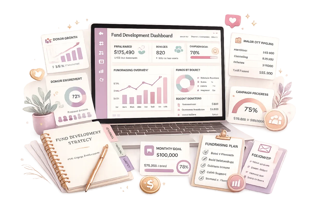 This is where you begin building your One-Person Fund Development Department—a practical system that helps one person do the work of fundraising with more consistency, strategy, and support.